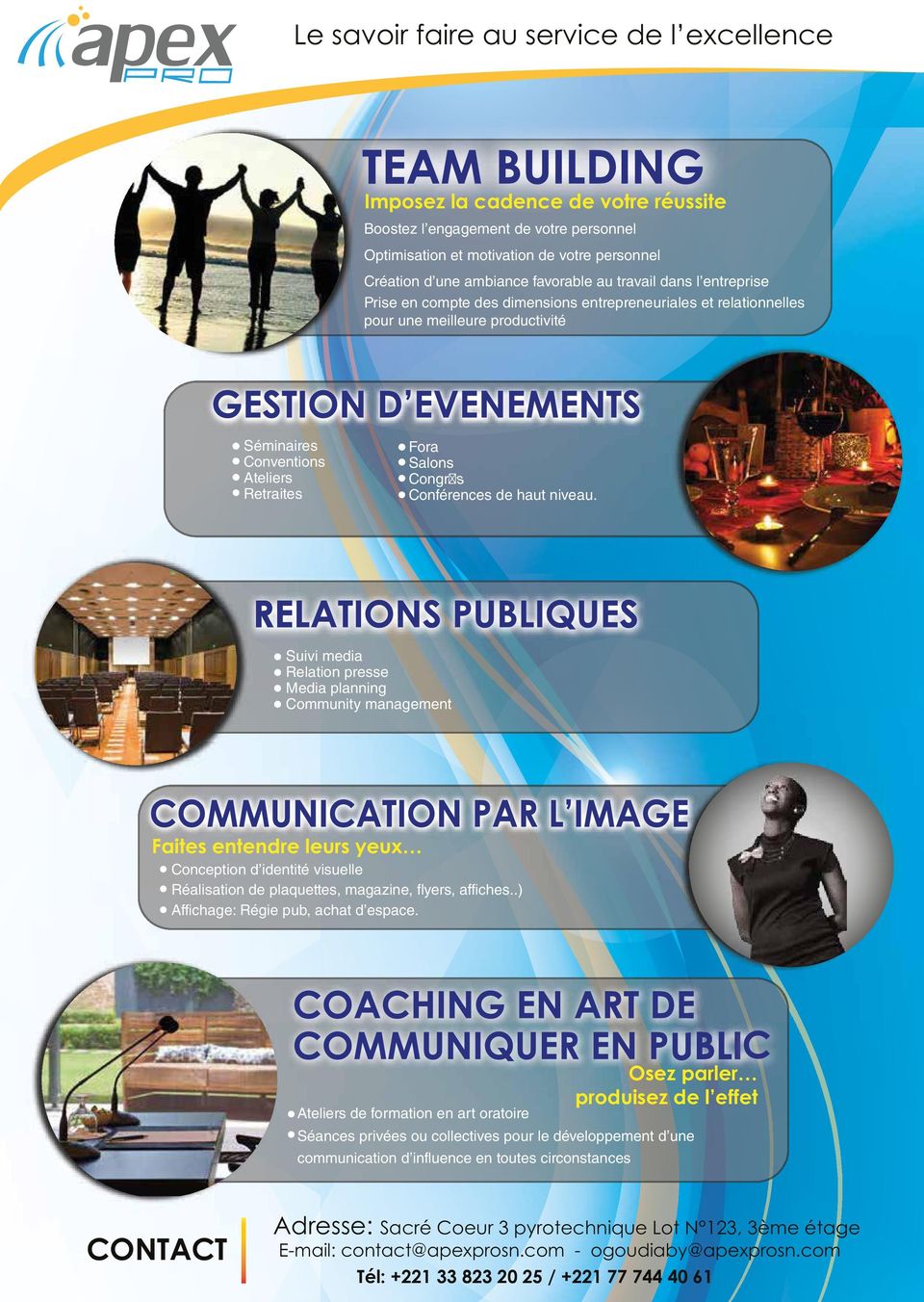 Cabinet spécialisé en stratégie de communication; organisation de team building, formation, gestion d'évènements institutionnels, communication par l'image